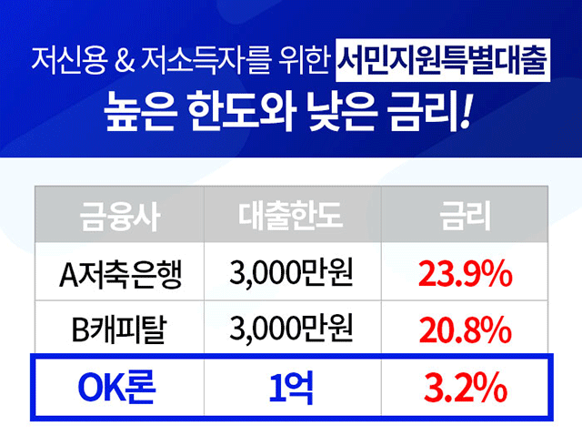 이러한 서민들의 어려움을 해결하고자 OK론에서 출시한 "서민정책자금" 이 화제다. 저 신용자, 저 소득자에게도 대출이 가능하도록 대출 조건을 완화하고 10년 이상 된 전문 상담사들을 통해 승인률을 크게 높였고, 간편한 절차로 당일 대출이 가능하도록 하여 대출 문의에 지친 서민들에게 희망을 불러일으키고 있다.